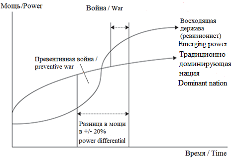 The 4:5 or 5:6 power ratio between the revisionist and the dominant nation represents the most dangerous moment for the outbreak of war between them [Tammen 2000: 31]. At the same time, according to empirical studies of the theory’s founders (based on the analysis of 32 cases), with a parity of power between the two strongest nations war occurs only in 18.8 % of cases, and peace remains in 81.3 % of cases [Organski, Kugler 1980: 50]. The probability of conflict increases if the rising power is heavily dissatisfied with the status quo. The dominant nation can start a preventive war without waiting for the rising power to overtake it in power. However, the “Phoenix factor” should be taken into account — even a country lying in ruins can almost completely recover in 20 years, after which it would be difficult to keep it from revenge [Organski, Kugler 1980: 142—144].