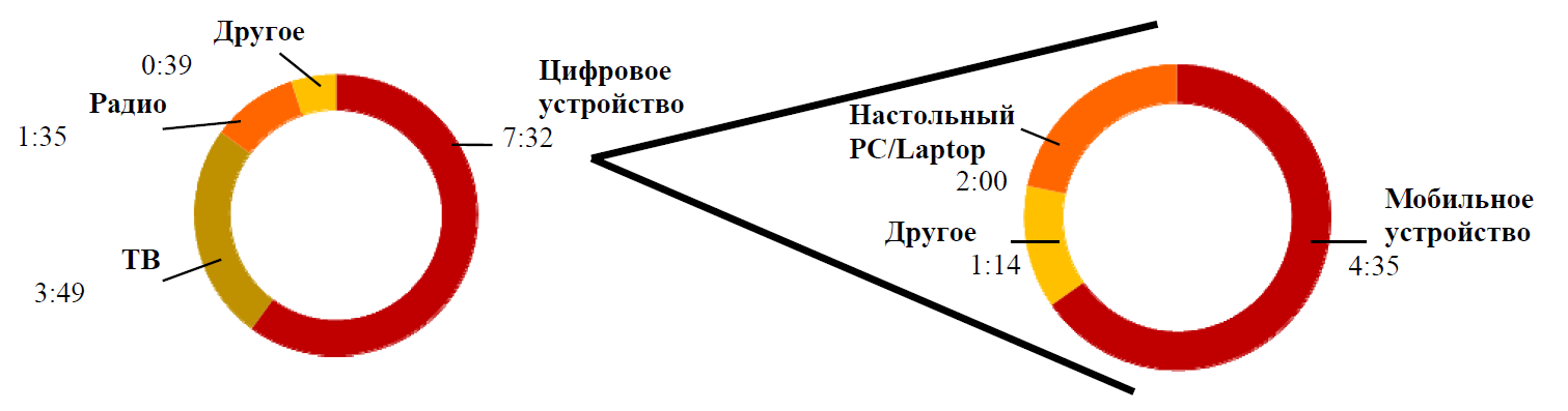 По состоянию на конец 2020 г., основная часть времени медиапользователей в мире (не менее 7 часов в день) тратится на цифровые устройства (на ТВ — только 3 часа) (рис. 1). Из указанных 7 часов почти 4,5 часа приходятся не на настольный компьютер, а на мобильные приложения.