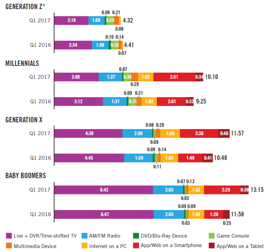 Так, если среди поколения бэби-бумеров (1944—1963 г.р.) ежедневно на просмотр телевидения и аналогичные форматы в 2016—2017 гг. затрачивалось почти по 7 часов времени, а на слушание AM/FM радиостанций — почти по 3 часа, то далее эта доля существенно сокращается. У поколения X (1964—1984 г.р.) — уже по 4 и 2 часа, у поколения миллениалов (Y) (1985—2002 г.р.) — уже по 3 и 1,5 часа, а у поколения зумеров (Z) (c 2003 г. по н.в.) — всего 2 и 1 час соответственно. При этом поведенческие паттерны у одного поколения со временем не сильно изменяются, а вот различия между поколениями очень существенны. Наибольшее количество часов за просмотром Интернета в смартфонах наблюдается у поколения миллениалов (в 2017 г. достигало 2,5 часов в день) (Turow, 2020).