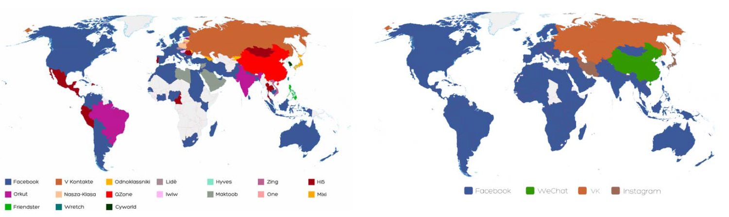 Рис. 8. Лидирующая социальная сеть по странам мира в июне 2009 г. (слева) и в январе 2022 г. (справа)