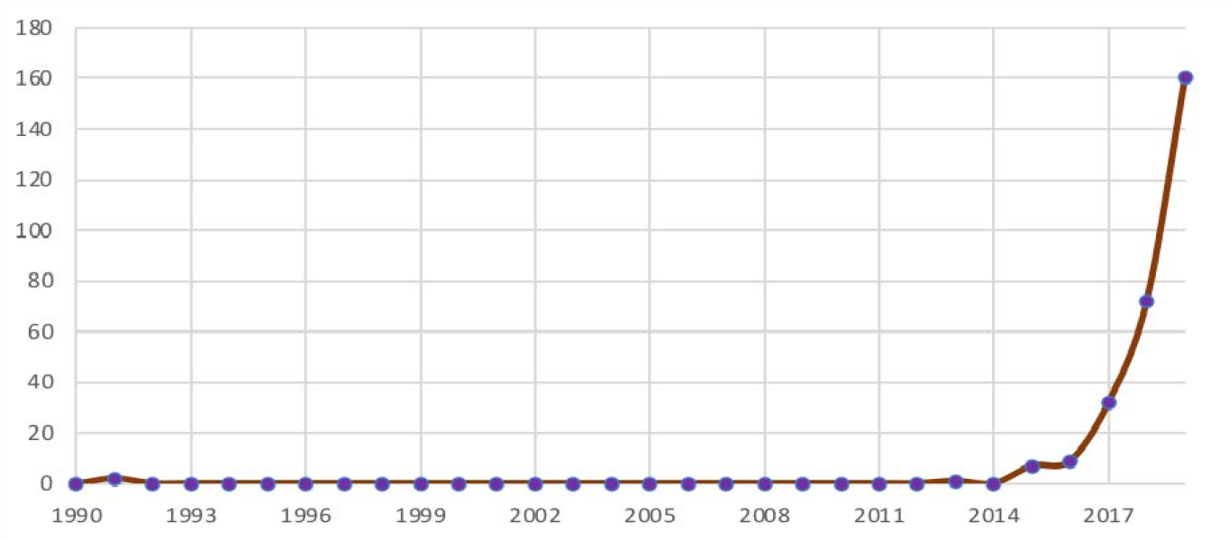 Fig. 3. Dynamics of terrorist activity in Burkina Faso according to Global Terrorism Database, 1990—2019