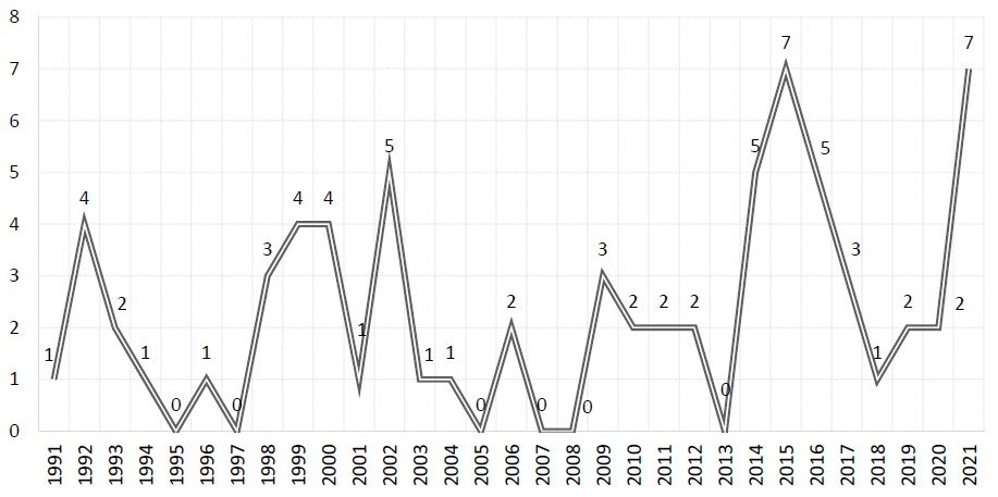 Fig. 2. Dynamics of Document Publications on Crimean Tatar Agenda in the Legislation of Ukraine Database, 1991—2021