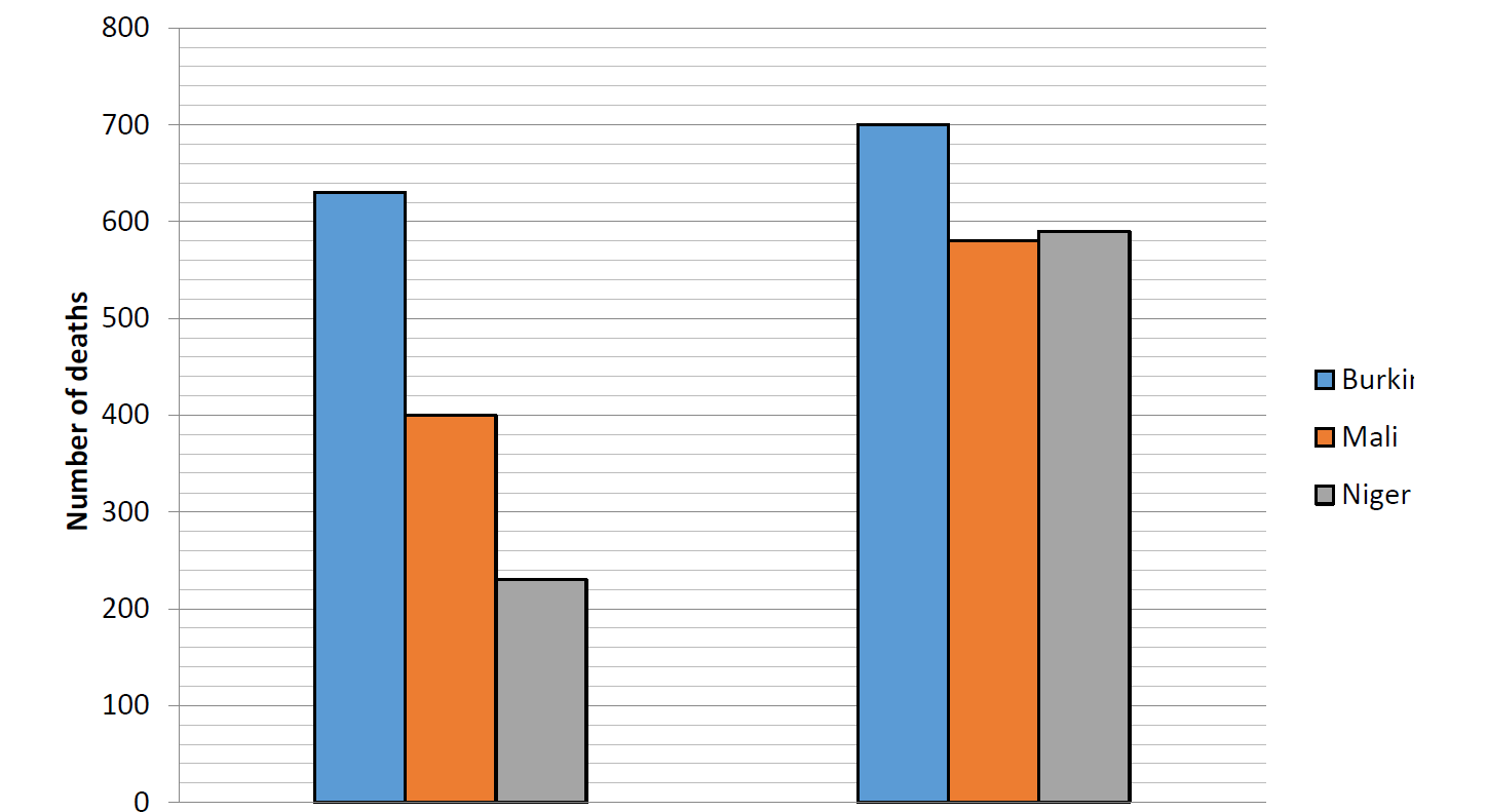 According to the Global Terrorism Index, the total number of incidents and deaths from terrorism in Burkina Faso, Mali, and Niger from 2007—2020 and the change in the number of deaths in these three countries from 2020—2021 increased exponentially (Figure 3 and 4).