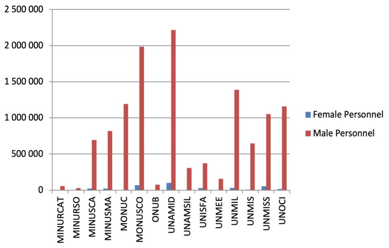An analysis of the number of women and men participating in 15 peacekeeping missions in Africa from 2003 to 2022 shows that the total number of men participating in each of these operations significantly outnumbers the female contingent (Figure 1). The maximum number of male staff reached 2,214,778 (in the African Union — United Nations Hybrid Operation in Darfur (UNAMID)), while the number of women did not exceed 99,517 (in the same operation). In addition, some missions, such as the United Nations Operation in Burundi (ONUB), the United Nations Mission in Sierra Leone (UNAMSIL) and the United Nations Mission in Ethiopia and Eritrea (UNMEE), had no female representation at all. Therefore, the UN missions that took place between 2003 and 2022 can be divided into two types: mixed, where both men and women were represented, and all-male, with no women present. Clearly, the UN and the AU have a significant amount of work to do to double the number of female personnel in their missions. This would not only uphold women’s right to professional self-determination, but also increase the effectiveness of peacekeeping operations through the equal participation of women in African peacekeeping.
