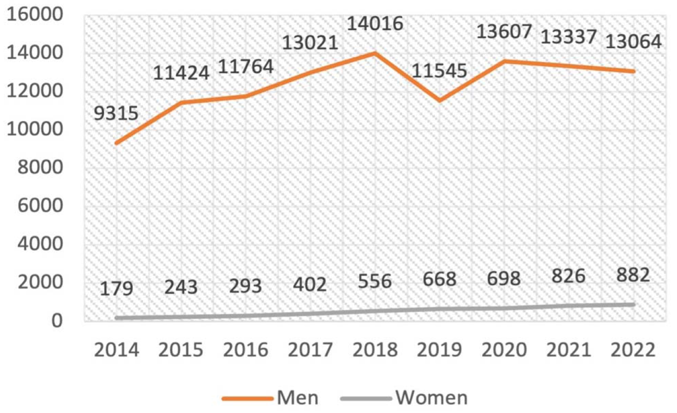 An analysis of the number of women and men participating in MINUSMA from 2014 to 2022 shows that the total number of men participating significantly outnumbers the female contingent (Figure 2). The maximum number of male staff reached 14,016 in 2018, while the number of women did not exceed 882 in 2022. Notably, a significant increase in the female contingent in MINUSMA began to be observed after 2016 (Figure 3), when a senior gender advisor was recruited in MINUSMA to coordinate gender mainstreaming and support the implementation of resolution 1325.[55] An additional function of the Gender Adviser was to raise awareness of the gender issues among MINUSMA troops.