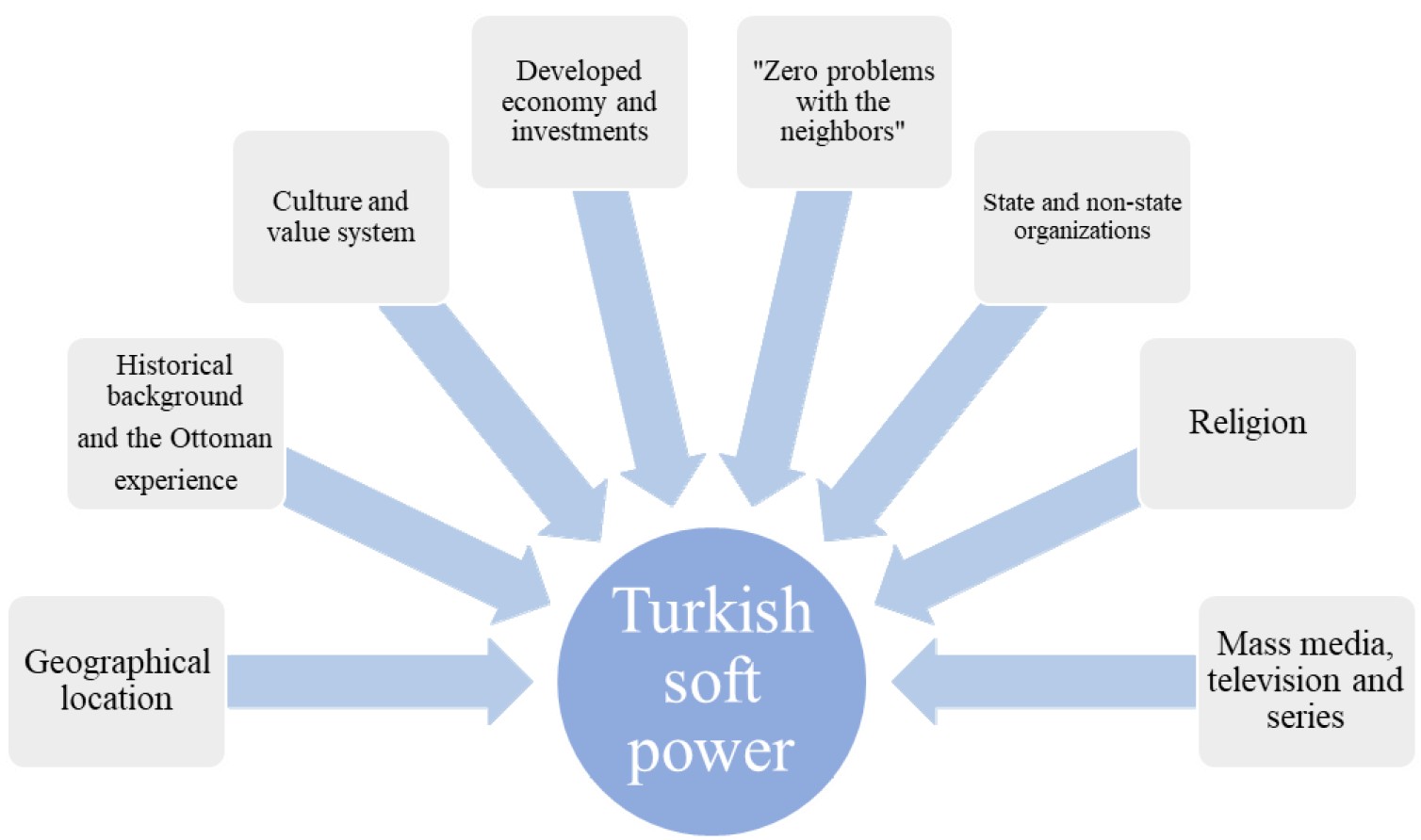 The concept of “soft power” has made it possible for many countries to achieve their foreign policy goals without using “hard power” with the risk of conflict clashes. Along with the world powers, this concept has been taken up by Türkiye. The geographical favorable location makes it possible to become an active participant in most regional processes. The geographical location also determines a rather large number of Türkiye’s neighbors. In the modern world eight countries share common land borders with the Republic of Türkiye: Armenia, Azerbaijan, Bulgaria, Georgia, Greece, Iran, Iraq, Syria; four countries have coastal zones in the seas surrounding Türkiye: the Republic of Cyprus, Romania, Russia and Ukraine. The multiplicity of neighbors and the complicated history of relations force Ankara not only to rely on traditional forms of diplomacy, but also to find other forms for the successful realization of its foreign policy interests.