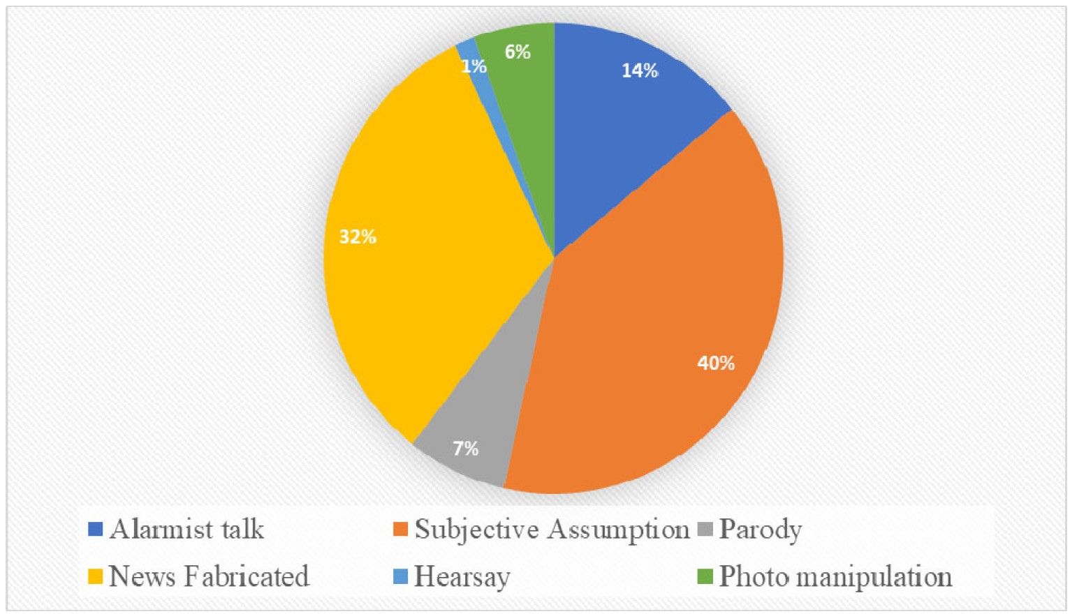 Based on the typology that the authors identified based on the data that has been collected, 40% of them are subjective assumptions (Figure 5). This means that people do not verify a story before sharing it with a large audience. Unfortunately, it also means that people do not read the entirety of the news and facts presented and only rely on their assumptions.