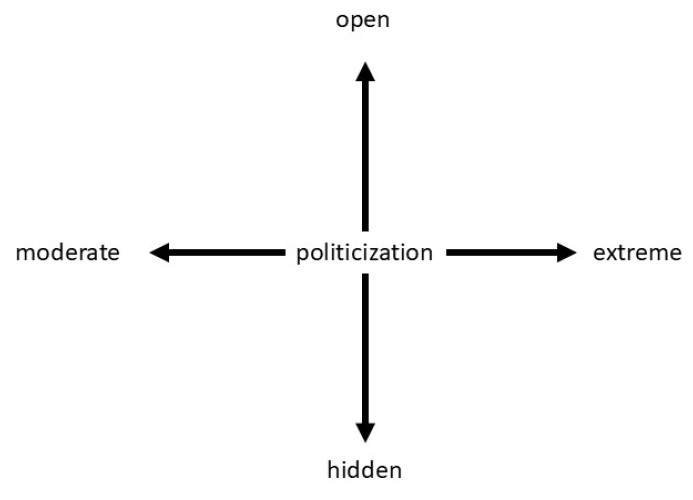 By analogy with inflation, politicization, as of its form of manifestation, can be both open and hidden. If politicization is open, states or other actors openly display it in documents, speech acts and actions. If politicization is hidden, states or other actors do not publicly associate themselves with it. Unlike inflation, politicization cannot be quantified. Nevertheless, it is acceptable to differentiate it into moderate and extreme.