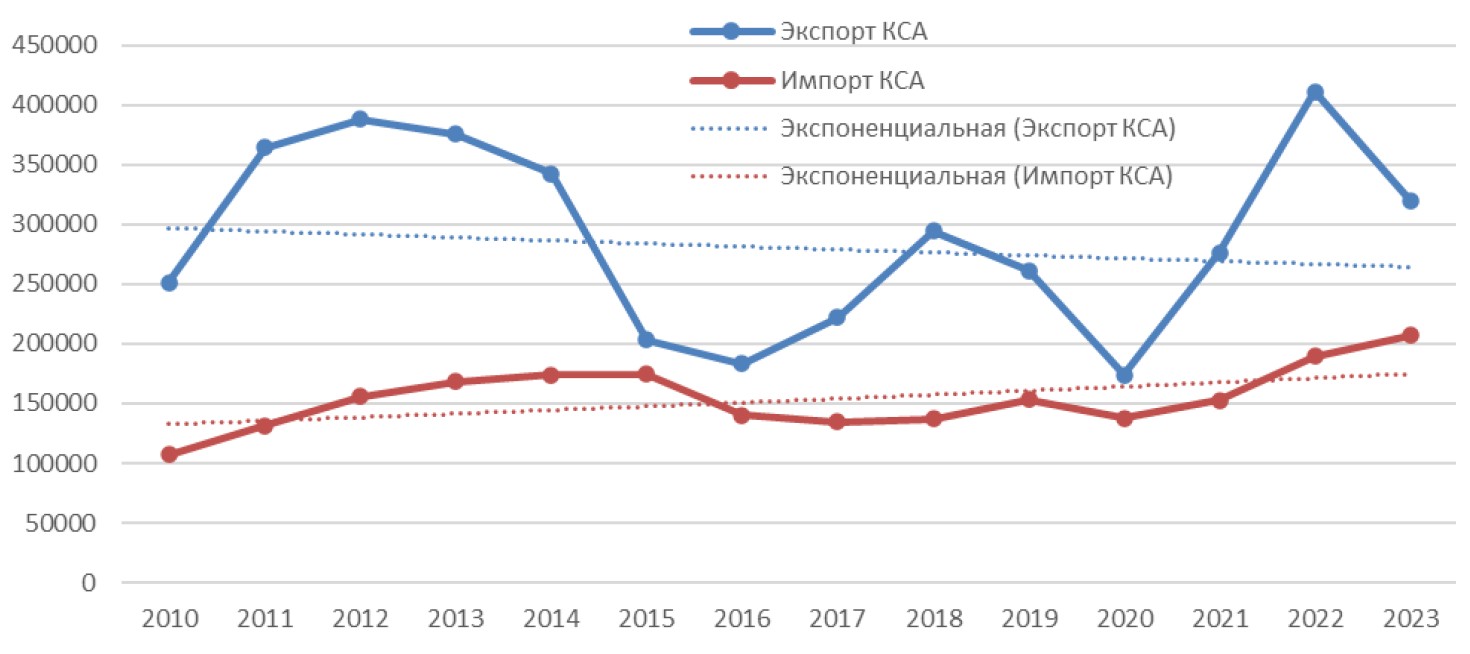 Figure 3. Dynamics of Bilateral Trade Between the Russian Federation and Saudi Arabia in 2010–2023, thousand USD, and the Export and Import Trend Line