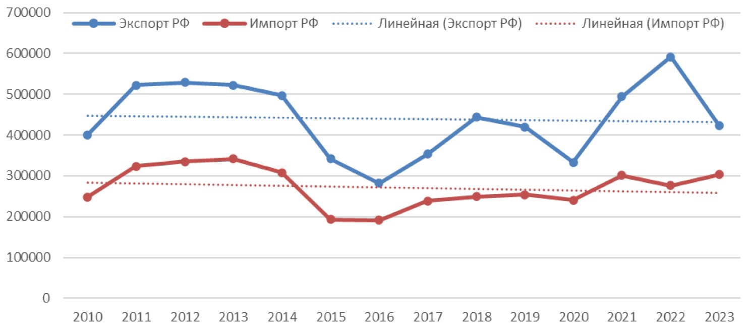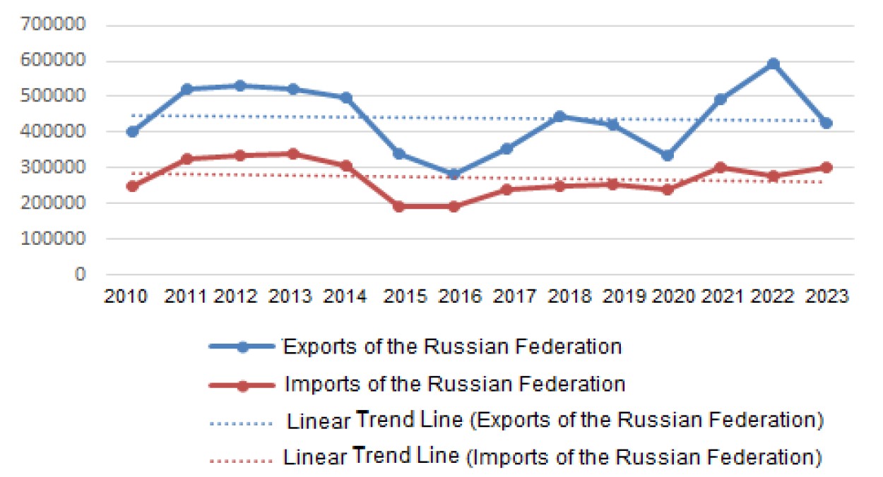 Figure 2. Dynamics of Foreign Trade of the Russian Federation in 2010–2023, million USD, and the Export and Import Trends