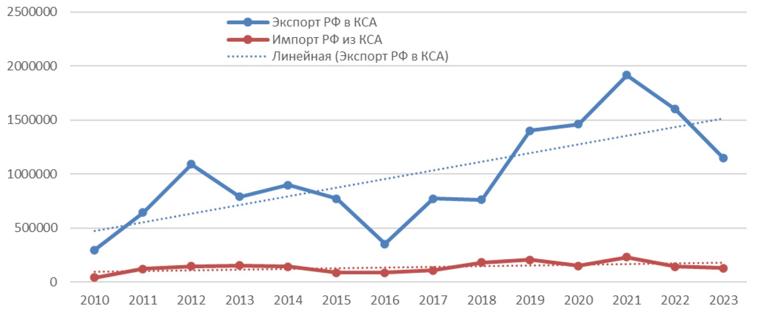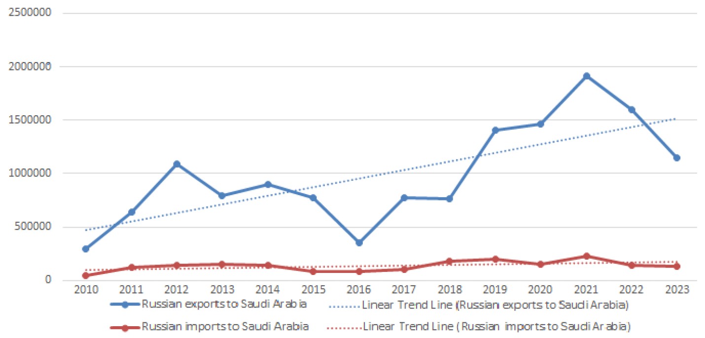 This study examines the dynamics of trade turnover between the Russian Federation and the Kingdom of Saudi Arabia (KSA) from 2010 to 2023, employing statistical and comparative analysis. Having used inductive and deductive methods, we aimed to identify the objective and subjective driving forces behind this process, its fundamental nature, long-term prospects, and potential consequences for both countries as well as for third-party actors. The sources of statistical data included the international database of the United Nations Conference on Trade and Development (UNCTAD), the Organization of the Petroleum Exporting Countries (OPEC), and the Federal Customs Service of the Russian Federation (FCS RF).