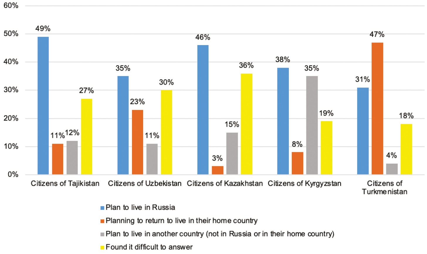 The majority of respondents’ desire to live and work in Russia reflects the current situation in most Central Asian states, which can be characterised as economic dependence on migration flows (Kurylev et al., 2018). In fact, the countries which direct their labour “for export” do not appear to be interested in taking significant actions to change their economic model that has developed in this way, to modernise their industrial capacities and restore enterprises that have collapsed after the USSR breakdown, or to increase funding for the science and educational area, healthcare, etc.