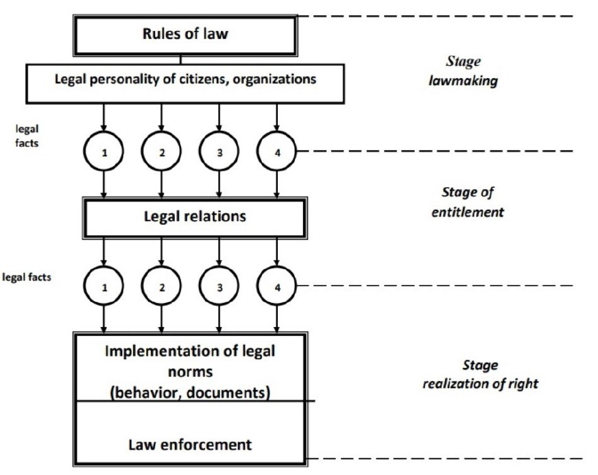 3) реализация норм права, т.е. фактическое упорядочение общественных отношений в виде поведенческих и/или документальных актов;