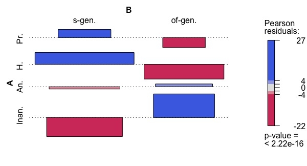 Figure 4. Russian genitive alternation along the animacy continuum (Cramer’s V = 0.21)