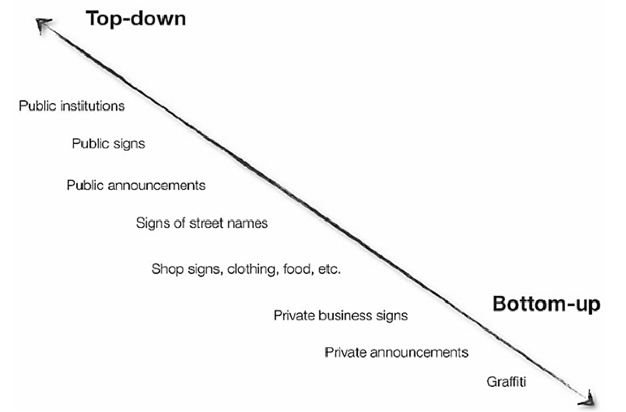 From a typological perspective, Landry and Bourhis (1997) furthermore divide signs in the LL into government signs and private signs, which were later conceptualized in terms of top-down and bottom-up approaches. Government signs (top-down) are linguistic tokens which are commissioned by the state or local government bodies and are professionally produced (e.g. road signs, public institutions, announcements, etc.). Private signs (bottom-up), on the other hand, include commercial and advertising signs and are often created by individual people; examples include shop signs or private business signs. Throughout LL studies, there is general agreement that language use in the LL falls into one of the two categories, i.e. top-down or bottom-up strategies, as summarized in Table 1 (Ben-Rafael et al. 2006: 14):