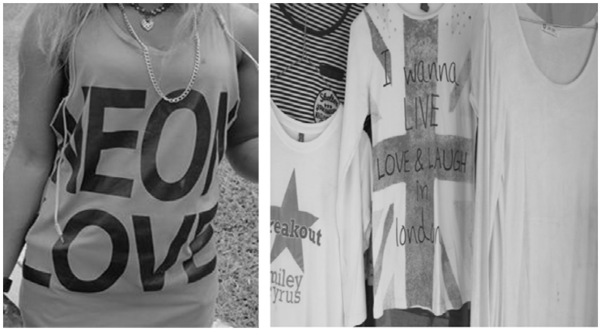 According to Greene and Williams, this allows us to include things that are more complex to define, such as T-shirts, as LL items (see Fig. 3). These are designed and manufactured by a company, but the individual expresses a personal choice by wearing them. Certainly, the printed T-shirt remains a prominent form of communication in our contemporary LL, but there is hardly any research that has examined the linguistics or semiotics of this unique mode of communication