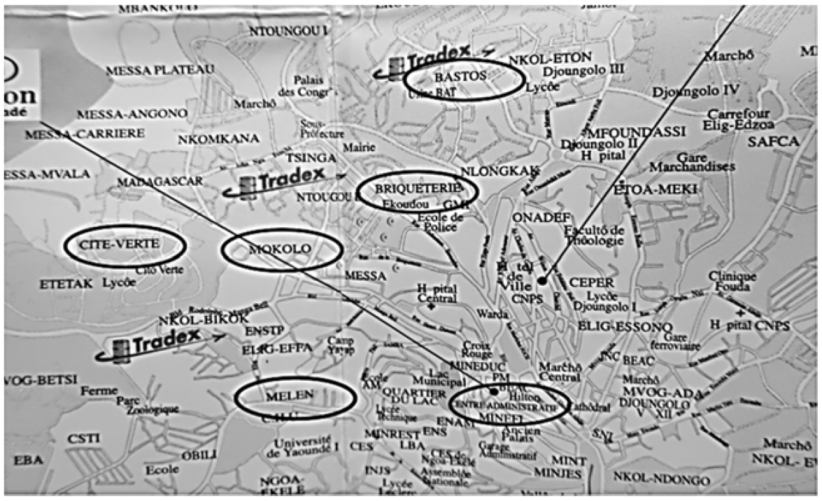 The main survey was carried out in 2016 (additionally, several related research trips to Cameroon were made between 2012 and 2016) and was conducted in six different regional districts of Yaoundé: (i) the administrative center (headquarters of government institutions), (ii) la Cité Verte (residential area), (iii) Mokolo (busy industrial quarter and the great market Marché Mokolo), (iv) Melen (touristic area, hotels), (v) Bastos (foreign embassies and expatriate communities) and (vi) la Briqueterie, or La Brique as it is called by its inhabitants (Arabic/Muslim quarter). See map in Fig. 5.