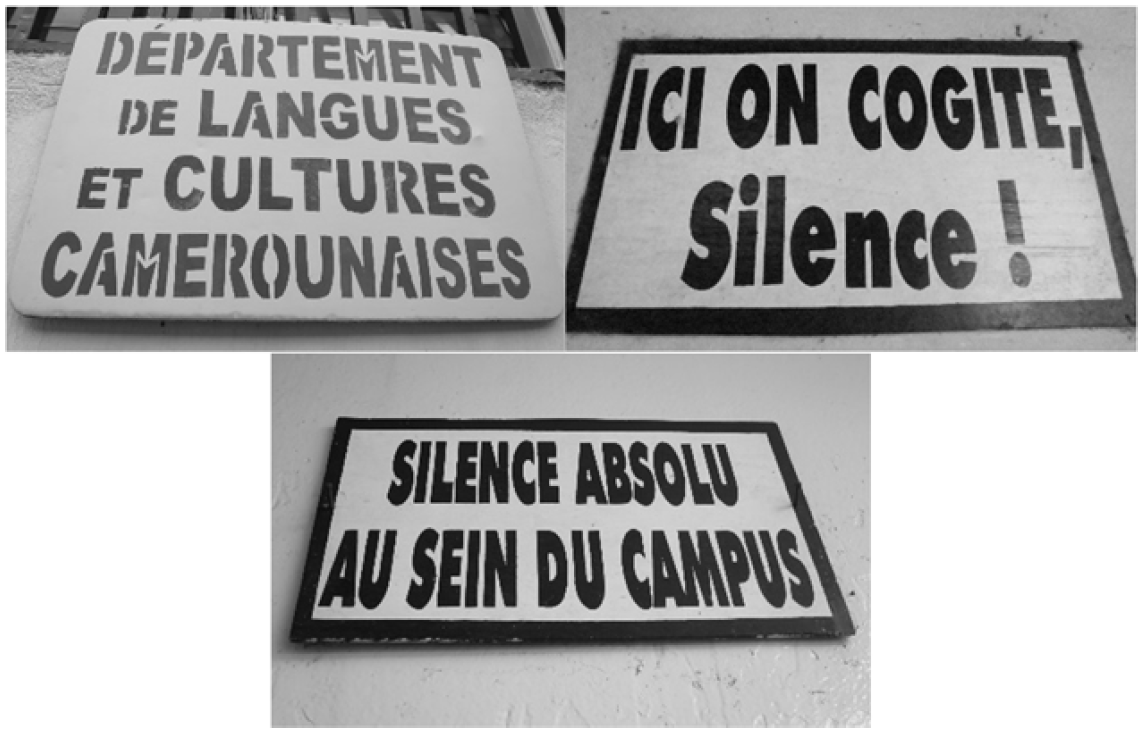 Generally, the LL of the university domain reveals a mismatch between their language policy and actual practices, and hence shows evidence of the dominant language ideologies, particularly those of the people in charge of the signage: administrators, sign-writers, lecturers, etc. Although the national policy of Cameroon as well as that of the University of Yaoundé promotes official bilingualism, the situation is typified by unequal power relations, as those in subordinate positions are obliged to use the languages of those in positions of power and authority. Needless to say, local/African languages are (almost) completely absent; some of the lingua francas such as Cameroon Pidgin English and Camfranglais do not prototypically characterize the LL design. Therefore, French, as the co-official language of the country, enjoys a status not equaled by any other language/variety in Cameroon.