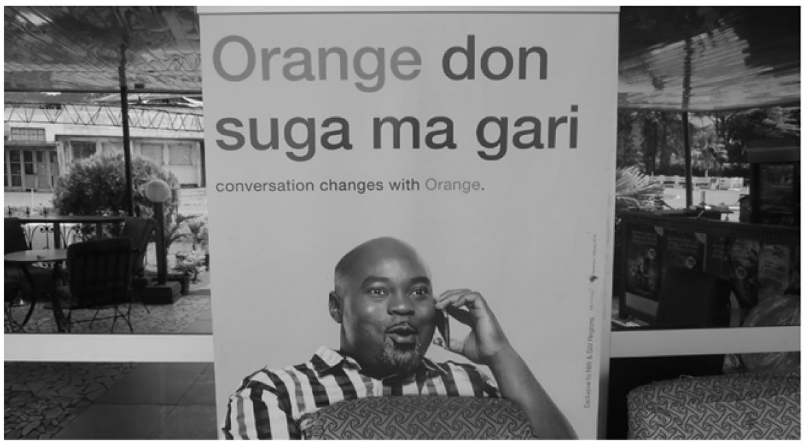 This is an advertisement in Pidgin English provided by the telephone company Orange which, however, is a French multinational telecommunications corporation. The wording “Orange don suga ma gari” literally refers to the idea that “Orange network has put sugar in my gari” (= type of food made from cassava, i.e. a very common and easily affordable food item); in other words, “Orange” has lightened his day or made him feel comfortable.