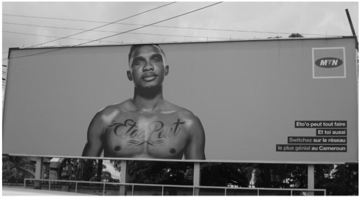 According to Simo Bobda & Fasse Mbouya (2005), Cameroon does have cases of mixture of English and French, resulting in what is generally referred to as Franglais. In addition to these phenomena, Camfranglais has developed in Cameroon resulting from a mixture, not only of English and French, but also of Pidgin English and various local languages. The commercial billboard in Fig. 14 shows the famous Cameroonian football player Samuel Eto’o who, together with MTN (Mobile Telephone Networks), draws attention to the company by addressing the audience (or passers-by) directly. The matrix language in “switchez sur le réseau” is French, which includes an English root (switch) attached to a French morpheme –ez (2nd person plural) meaning “switch on the internet”. This type of code-mixing is characteristic of Camfranglais and generally of languages in contact in Cameroon; the typical speaker daily switches between three and more codes, not necessarily within one and the same word, but rather from utterance to utterance (inter-sentential switching) or speech event to speech event.