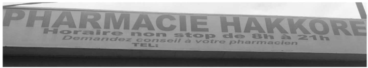 Concerning the word “Hakkore” in the name “Pharmacie Hakkore,” this is an Ewondo lexical item meaning “to save” (Fig. 17). So, “Pharmacie Hakkore” refers to a pharmacy where people can get drugs so as to be “saved” (personal communication, Lozzi Martial Meutem Kamtchueng). The word “saved” is here used for marketing purposes.