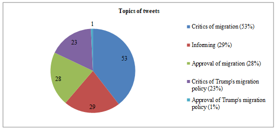 According to the obtained results, the authors of the explored tweets were both men and women. A great number of messages for the defined period were generated by organisations and news media. However, the investigation was based on the analysis of the tweets of ordinary users. The majority of tweets (53%) criticised contemporary migration processes, both legal and illegal. More than a quarter of the users (28%) articulated their approval of migration and backed up immigrants. A smaller percentage of messages (23%) showed discontent with the migration policy by D. Trump. The tweets, generated to inform other users of events and sharing a link to an external source of information, comprised almost one third (29%) of all investigated messages. Figure 1 presents the ratio of topics in February-July 2017.