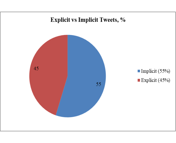 As illustrated in Figure 2, the number of implicit tweets (55%) slightly exceeds the number of explicit ones (45%).
