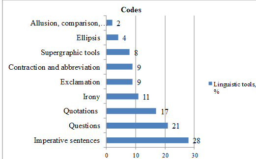 The results of the linguistic analysis of tools by Atlas.ti program are shown in Figure 3. Each linguistic phenomenon was used as a separate code.