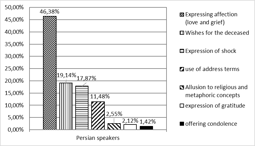 As can be seen in Table 1, the most frequent condolence strategy employed by native Persian speakers was Expressing affection (n = 109, 46.38%). Also it was observed that the least frequent one was Offering condolences which was produced only once (0.42%) by native Persian speakers. The findings are also depicted in Figure 1.