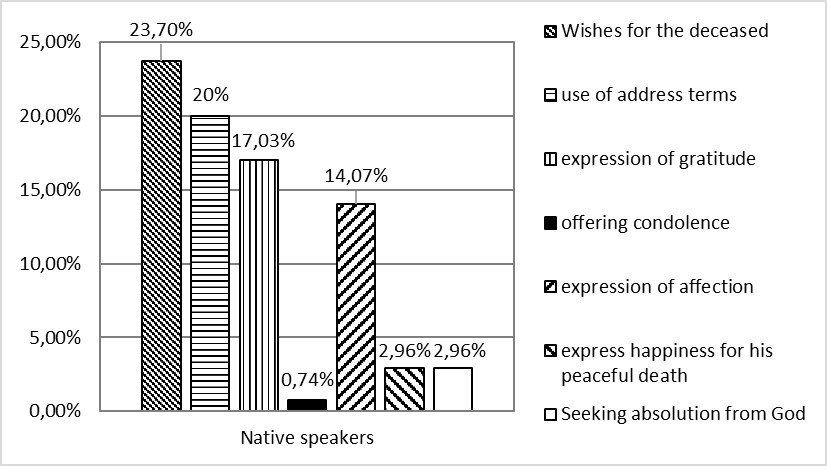However, our findings are not in consonance with that of Wakefield, Chor and Lai (2020) who found that for English native speakers the main focus was on expressing grief for a person’s death. By contrast, the current study revealed that the main condolence strategy used by native English speakers was expressing good wishes for the deceased. The present study’s findings are also not totally in line with Nurlianingsih and Imperiani (2020). To be more specific, although seeking absolution from God was among the observed condolence strategies in this study, it was not ranked the first in any of the groups. This is however in contrast with Nurlianingsih and Imperiani (2020) who reported that Indonesian speakers mostly use this condolence strategy, seeking absolution from God, in their talks.