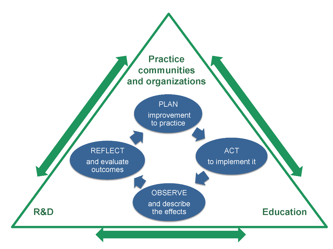 Moving into the context of applied translation studies, this article concludes by proposing an integrated model of transdisciplinary action research, rendered visually in Figure 1. It comprises a triangular interactional frame with bidirectional vectors running between the three vertices research and development (R&D), education and, at the apex, communities of practice and their organisations. Within this frame lies the core investigative cycle of the action research process. It is a model that graphically represents the transition that applied translation studies is beginning to make, and must continue making, in order to research and serve the realities of translation in the field. There is a compelling argument for transdisciplinary action research to shape and guide the necessary progression.
