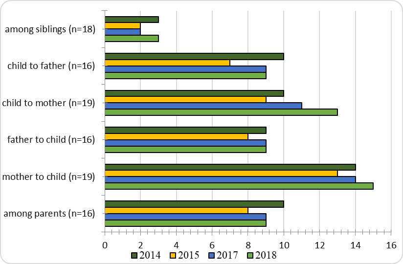 In order to gain insight into the consistency of language use in intrafamily communication, we asked our participants to reflect on their code-switching between Russian and German in interactions with different members of the core family. Figure 2 depicts the number of participants who stated that they regularly code-switch when communicating with the respective addressees. Again, the participants observed that they most often resort to code-switching when talking to their mothers which obviously mirrors the fact that mothers are most frequently addressed in Russian (see Figure 1). However, there seems to be a decrease in the amount of code-switching with parents over time. This clearly contrasts with code-switching when talking to siblings where more participants reported on instances of code-switching in the later waves of data collection compared to 2014 (increase from six participants in 2014 to eight participants in 2018). Still, the ratio of use of Russian when communicating with siblings is obviously quite low in the investigated sample.