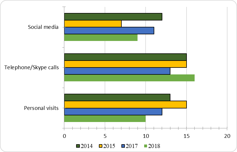 When asked about the efforts that are made to stay in touch with relatives and friends in the home countries of their parents, almost all participants (18 in 2014, 19 in 2015) claimed that they keep in touch with the countries of origin. These numbers drop, however, towards the end of our longitudinal studies: in 2017, only 17 participants reported on such contacts, in 2018, 16 participants continued their communication with family members and acquaintances in Russian-speaking countries. Figure 3 shows the ways in which these personal contacts are maintained.