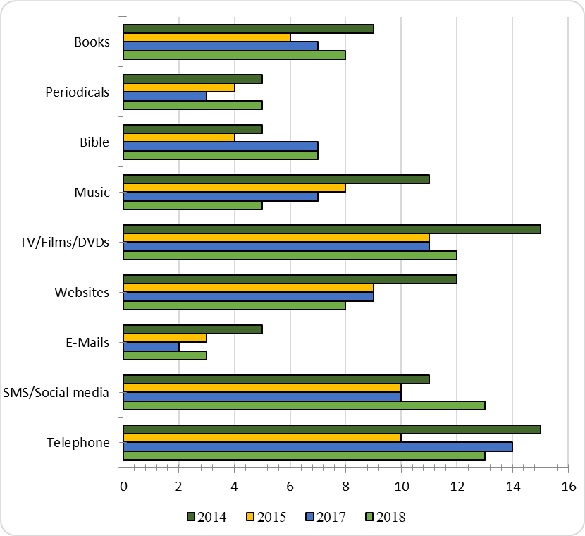 Our participants use their heritage language predominantly for media that enables them to stay in touch with friends and relatives (telephone, SMS, WhatsApp, social media like Facebook), with social media and short messenger services becoming a more important means over the examined period (13 out of 19 participants use Russian both for telephone calls and social media in 2018). Among the media that primarily serve entertaining functions our participants mostly resort to Russian-language TV programs and films, although the number of participants who regularly watch Russian films and TV programs is decreasing over time (15 in 2014, 12 in 2018). The same applies for visiting websites in Russian. An even more rapid decrease can be observed in the domain of listening to Russian music (11 participants in 2014, just five in 2018).9 Classical print media such as books or periodicals are regularly consumed in Russian only by a minority of participants in our sample, with Russian books being far more popular than periodicals. This might be related to the fact that there is a high share of participants who still attend heritage language classes or classes in Russian as a foreign language, where reading (excerpts of) texts in Russian comprises an integral part of the teaching program. Media that require the active composition of longer texts in Russian (E-Mails) are the least popular in our sample. Generally speaking, there is an average decline in the regular use of Russian in almost all types of media, but still the number of participants who use or consume media in Russian is comparatively high when compared, e.g., to heritage speakers of Russian in the U.S. (cf. Carreira & Kagan 2011).