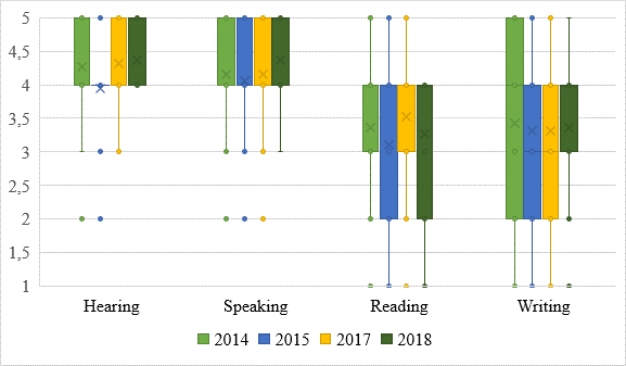 10 Average scores for the data obtained in the last wave of data collection (2018): Hearing: 4.37 (Russian) / 4.16 (German); Speaking: 4.37 (Russian) / 4.21 (German); Reading: 3.26 (Russian) / 3.84 (German); Writing: 3.37 (Russian) / 4.0 (German). There are no major changes in these values throughout the examined time span for German. Interestingly, however, the average scores for hearing and speaking German show a slight decrease over time, while the opposite is true for these modalities in Russian.