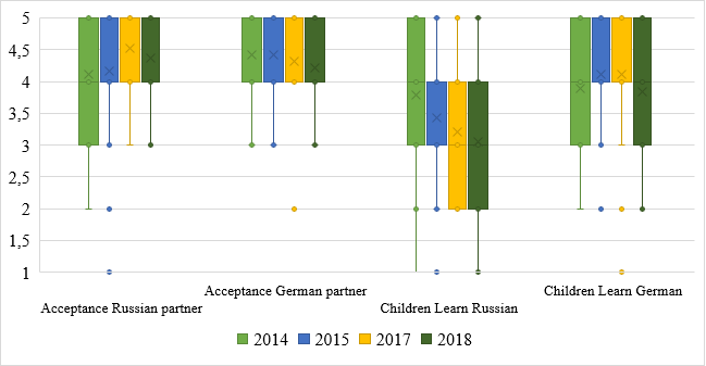 Figure 6. Assessment of statements (i) “I would not mind having a German-speaking / Russian-speaking partner” and (ii) “I want my children to first learn German / Russian”