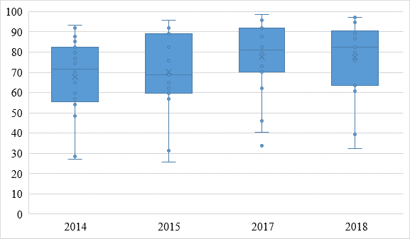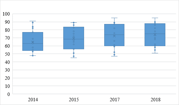 A look at the data reveals a steady increase in average lexical correctness scores. The average correctness scores rise from 64.74% in 2014 to 74.16% in 2018. A one-way repeated measures ANOVA yielded a highly significant improvement for the investigated time span (F = 21.086, df = 3, p < .00001).