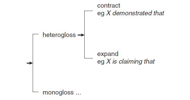 The expression of stance can take two possible directions for the writer following the engagement framework (Fig. 2); the author can “make[s] allowances for dialogically alternative positions and voices” (Martin & White 2005: 102); he/she is thus said to open the dialogue with the audience and be dialogically expansive, or “act[s] to challenge, fend off or restrict the scope of” (ibid) other voices in the text. In this case, the writer is said to be dialogically contractive by closing the possibility of a dialogue with potential audience. The study of stance using this system not only unveils the writer’s authorial positioning but also foregrounds the resulting voice that the writer constructs throughout the text.