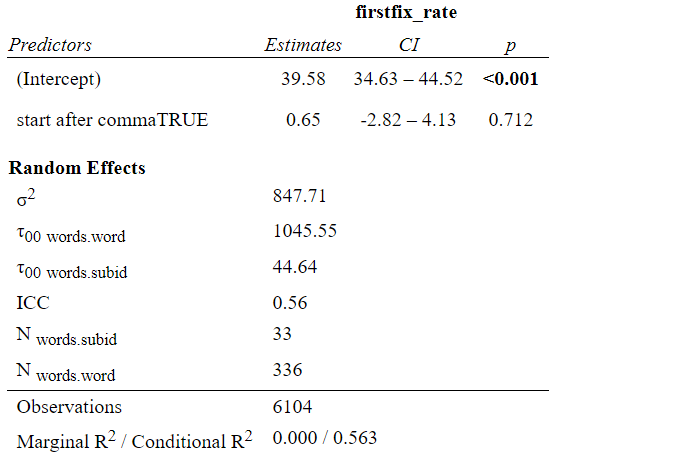 The results for the two LME models are presented in Figures 2 and 3. Figure 2 confirms that the RFFD on a word after a comma is significantly longer when it is the first word in an EDU than when it is in a middle position. Figure 3 shows that there are no significant differences for the first words in an EDU preceded or not preceded by a comma.