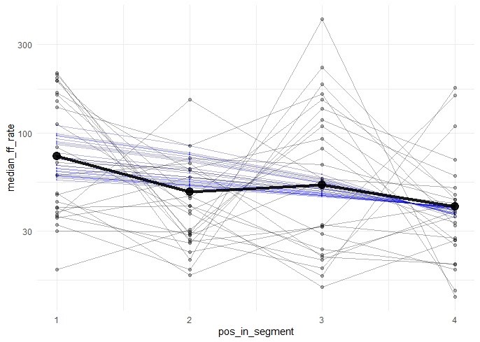 The t-test revealed a statistically significant difference in RFFD and RTFD between the first and the third word in the EDU (t = 8.59, df = 32, p < 0.001 for RFFD; t = 4.21, df = 32, p < 0.001 for RTFD). Average RFFDs for the words in different positions are also presented in Figure 1. The thin gray lines are for separate EDUs, the black dots represent an average RFFD for a position. The blue lines are model predictions for EDUs. We can see that there is a tendency for decreasing the relative first fixation duration while moving further away from the first word in the EDU. In addition to that, the t-test comparing the first word RFFD characteristics in an EDU vs. in a sentence revealed no significant differences between sentences and EDUs (t = 1.16, df = 51, p = 0.27).