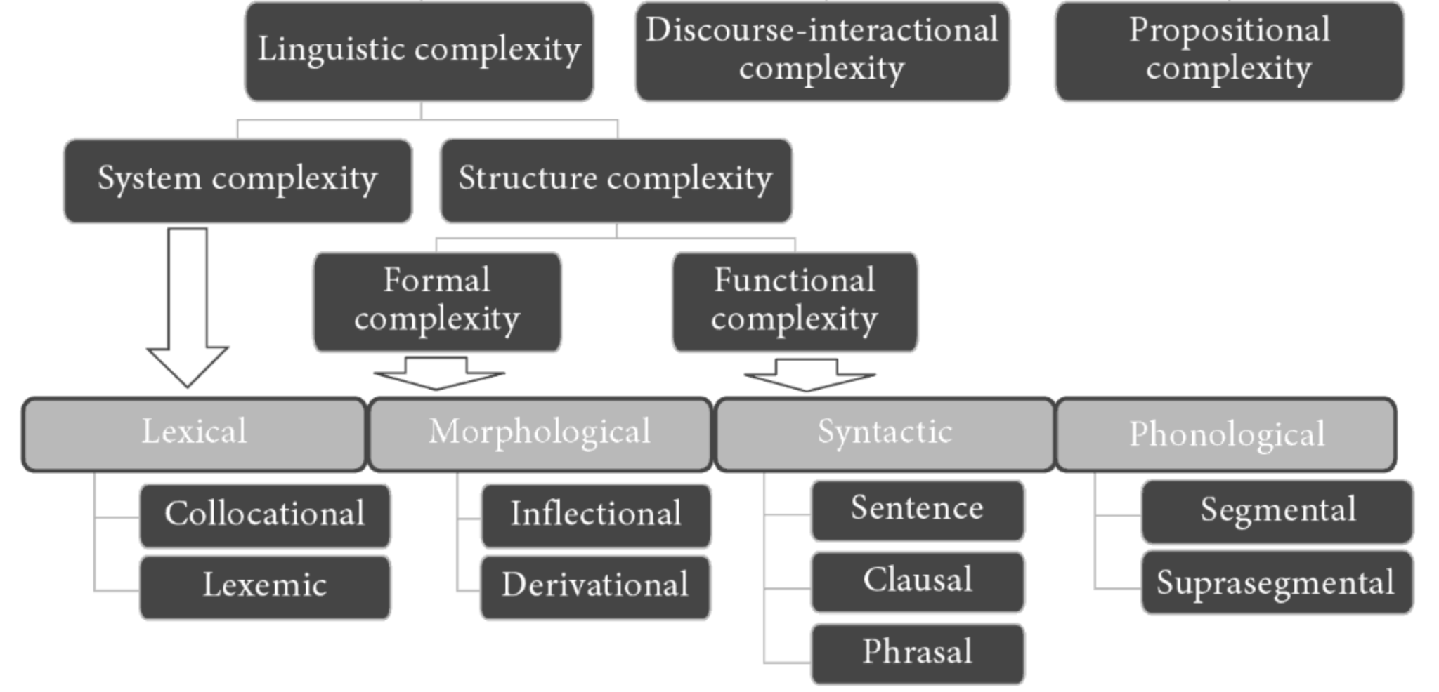 Text complexity is one indicator that can be used to assess authors’ written and spoken skills and how varied and complex are the means of linguistic expression they apply. Starting with the work of Norris and Ortega (2009) and two publications by Bulté and Housen (2012, 2014), researchers agree that complexity is a multifaceted phenomenon, consisting of several sub-constructs, dimensions, levels, and components, and many of these constructs and sub-areas have been independently evaluated. Consequently, the term ‘‘complexity’’ has been widely applied to manifestation of objective properties of linguistic production. Bulté and Housen (2012) also draw the distinction between propositional complexity, discourse-interactional complexity, and linguistic complexity. Of these three, linguistic complexity of written production, will be the target of the present article.