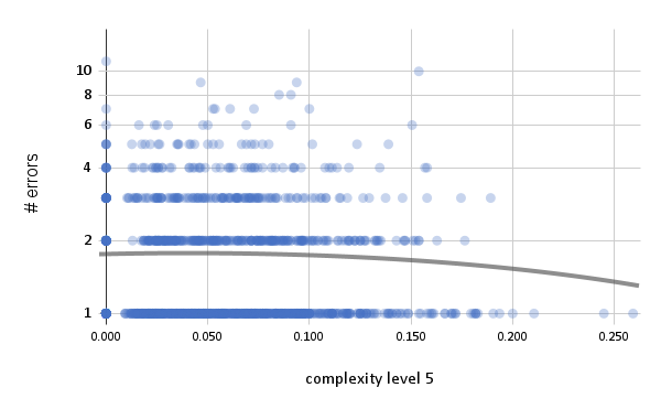 We repeated the same experiments with the argumentative essays (391 documents with one error, 321 documents with more than one error). No effect of complexity was found in both non-parametric analysis of variance and logistic regression (all p-values > 0.05). Therefore we conclude that there is not enough evidence to support the need for selective modelling one-inflation in our datasets.