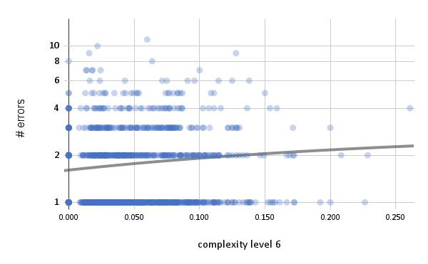 We ran a rank-sum one-way analysis of variance, dividing the graph description essays into two groups: texts with one error (376 documents) and texts with two and more errors (219 documents). The results suggest that there is no difference between these two groups in regard to their complexity indices, except for level 6, see Table 8. Furthermore, the effect of the suffix complexity was not found in the binary logistic regression models for these groups conditioned by complexity (p-value>0.05 for all four coefficients in various combinations, also with backward elimination of predictors from a full model).