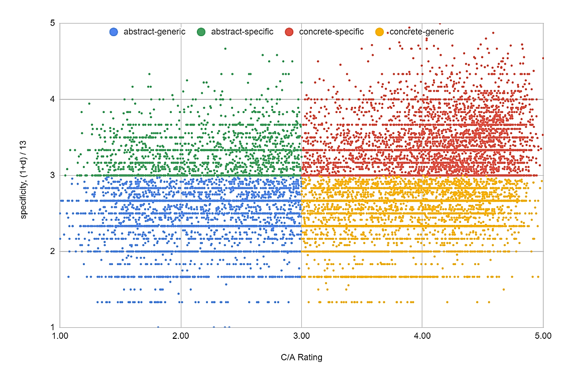 Fig. 12. Word distribution in two-dimensional space of concreteness-specificity (Ivanov & Solovyev 2021)