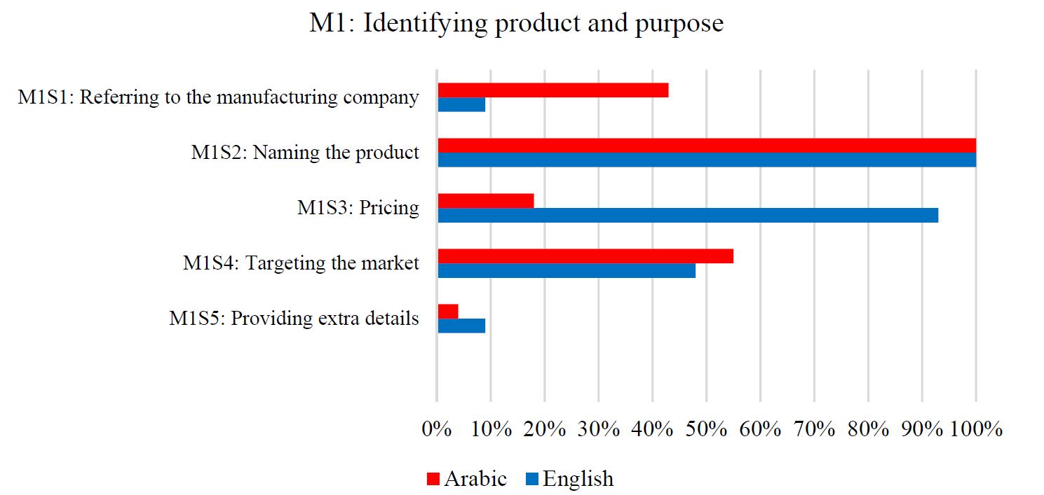 As shown in Table 5, M1 consisted of five steps which were found in each language sub-corpus, albeit to a different extent as far as their prominence levels are concerned. As can be seen in Fig. 1, ‘naming the product’ was a prominent step within M1 in the two sets of data. However, while ‘pricing’ was deemed a prominent step in the English advertisements, ‘targeting the market’ was regarded prominent in the Arabic advertisements. The following figure illustrates the frequencies of steps within M1 in both datasets.