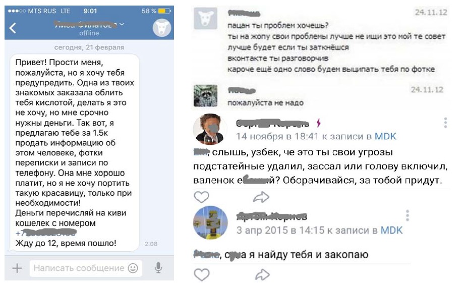 При составлении исследовательского корпуса мы столкнулись с рядом трудностей, что сказалось на относительно скромном количестве отобранного материала: сообщения-угрозы были представлены в виде скриншотов (в некоторых случаях с цензурой), к которым прилагались комментарии пользователей; многие сообщения-угрозы практически моментально удалялись или блокировались администраторами интернет-ресурсов; не всегда удавалось установить такие параметры в сообщении-угрозе, как гендер, возраст агенса и пациенса (проверка проводилась по сведениям профилей пользователей или по морфологии и синтаксису анализируемых сообщений-угроз5). В результате отбора в исследовательский корпус вошло 65 сообщений-угроз (охват c 2015 по 2021 год6) на русском языке, извлеченных из контекстов реального (не сценированного) коммуникативного взаимодействия, обнародованных на различных коммуникативных площадках в Интернете: Vkontakte (отобрано 52 единицы), Instagram7 (4), WhatsApp (4), Viber (3), Odnoklassniki (1), Twitter (1). На рис. 1 представлены примеры исходных материалов, вошедших в исследовательский корпус сообщений-угроз.