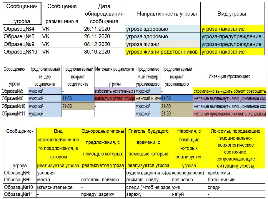 Подводя итог методологического раздела статьи, обратим внимание на разработанность признаковой базы для определения вербализованных прямых угроз. Существующие исследования условно можно объединить в две группы. Первые описывают вербализацию угроз вообще: в этих исследованиях акцент делается на обнаружение признаков угрозы на разных уровнях языка. Вторые приводят результаты экспертных исследований, в которых рассматриваются частные случаи вербализации угроз через призму их правовой допустимости.