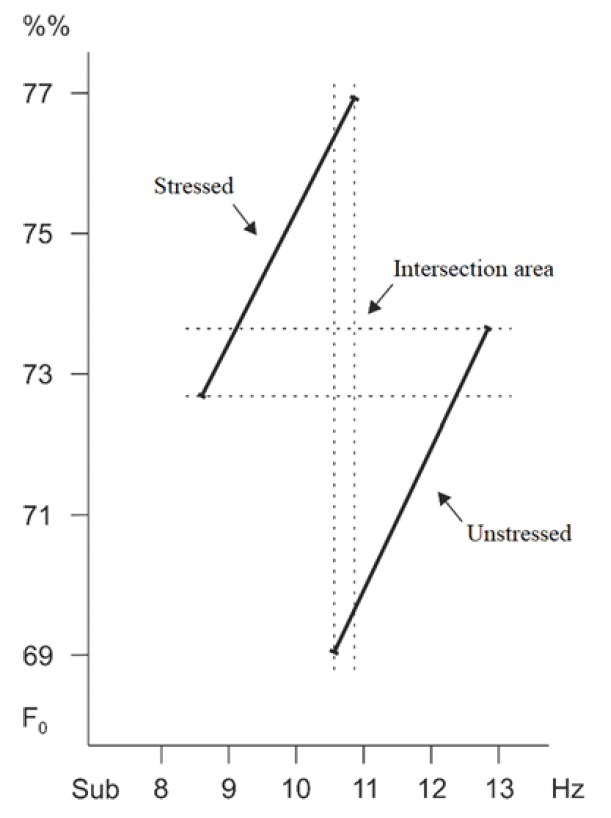 The examination showed a highly significant connection between pitch (F0) and subsonic frequency of the larynx fluctuations (Sub) on the one hand and word stress on the other. The syllable nucleus duration and vertical larynx position (VLP) proved to be insignificant. In the stressed syllable F0 increased by 4.6% (Sig=0.019) which is consistent with previous studies on word stress in Persian carried out by other authors. According to the statistical analysis, 95%-confidence intervals for pitch (F0) and subsonic frequency (Sub) in stressed and unstressed syllables overlap (Figure 11), i.e., syllable nuclei which fall into the intersection area can be perceived as both stressed and unstressed.