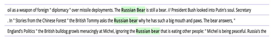 Second, we focused on corpus, discourse, and diachronic analyses of the metaphors. Two representative collections of texts were chosen as sources of the data: the Corpus of Contemporary American English (COCA) and Chronicling America: The National Endowment for the Humanities and the Library of Congress (CA). COCA is a large and representative corpus of American English, containing texts from 1990 up to 2019 and having (among others) two special sections of popular magazines and newspapers. The range of the queries that we used when working with the corpus, limiting the date range from 2000 to 2019, was a) browsing a frequency list of the top 60,000-word list and searching by individual word (the word that we thought a possible source domain was to be included into the list (Fig. 1: for example, ‘bear’ as a noun ranks 1982 among top 60,000 lemmas (words) in the corpus), b) analyzing its collocates, clusters, and concordance lines: it was obligatory that some of them (collocates, clusters, or concordance lines) contained ‘Russia’ or ‘Russian’ (Fig. 2: for example, ‘RUSSIAN BEAR’ is registered in clusters for ‘bear’ as a noun and in concordance lines), c) interpreting its meanings and use in the context of the XXI century media discourse (Fig. 3).