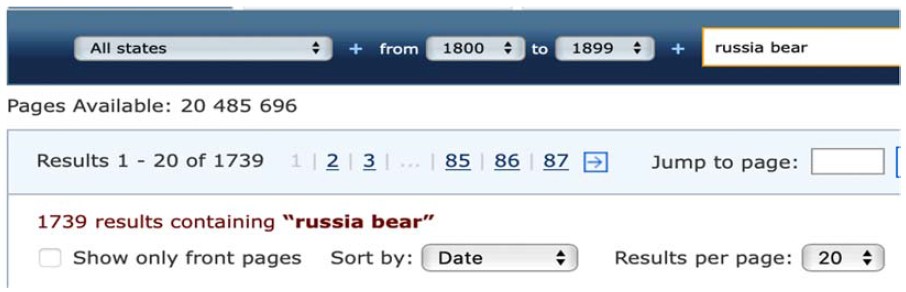 The second corpus, used for collecting the data, CA, is a searchable database of US newspapers with descriptive information and select digitization of historic pages from 1770 up to 1963. The most common formats for storing texts found in this digital archive are jpg and pdf. For this reason, the only possible way to collect the data from the corpus was to use the Advanced Search engine, limiting the search by language (English), period (1800–1899, 1900–1963), option of searching all the words that included the target domain (Russia) and a source domain (the name of the animal) within 5 words of each other (the fewest possible that the engine allows) (Fig. 4: for instance, the search results with the option of searching all the words (Russia, BEAR) within 5 words of each other in the date range from 1800 to 1899 contain 1739 texts).